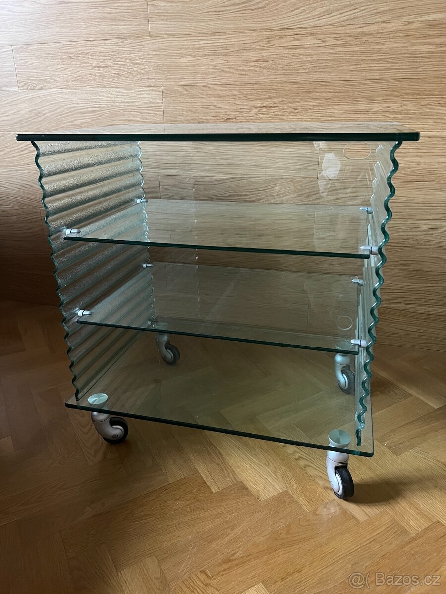 Skleněný TV STOLEK na kolečkách od FIAM Italia - design RON ARAD. Lze použít i jako úložný regál.