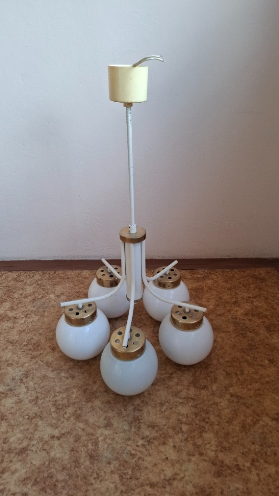 retro designový lustr - Kamenický Šenov 70. léta - [28.4. 2026]Retro lustr z kovu a opálového skla, odkazující svými tvary a barvou na bruselský styl. Vyroben v 70. letech v Československu v Kamenickém Šenově. Lustr se skládá z několika dílů. Stínidlo je z bílého mléčného skla, kovového výrazně oranžového skleně ...