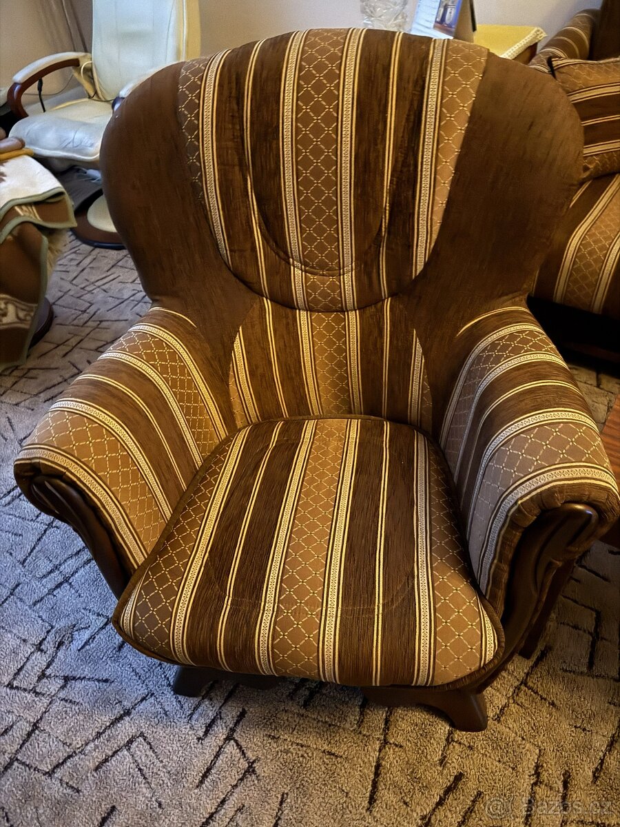 Pohovka a dvě křesla. Látka kombinovaná se dřevem, téměř jako nová, málo používaná.