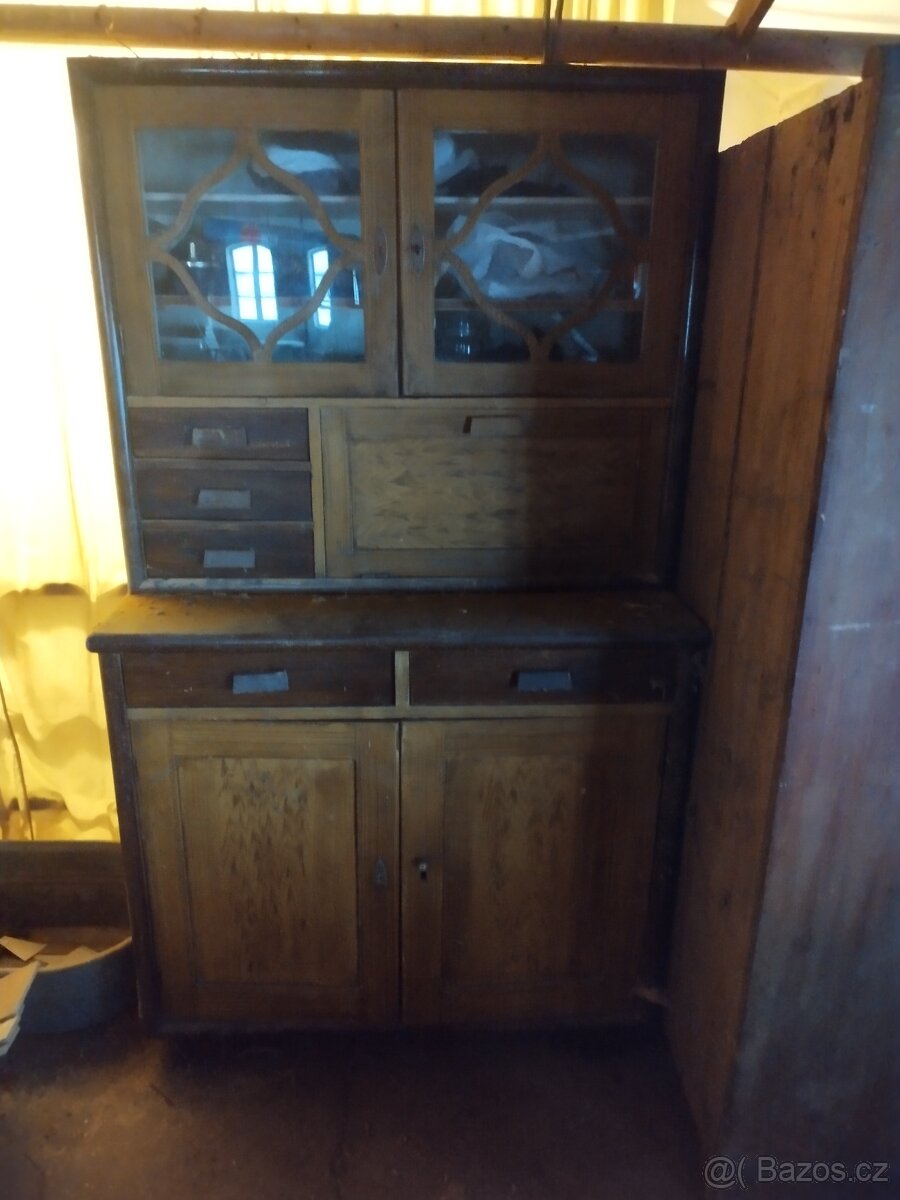 Prodám starožitný kredenc za symbolickou cenu, ve stavu, ve kterém jsem ho našel. Viz foto. Rozměry:šířka 108cm, výška 190 cm, hloubka 55cm, užší prosklená část hloubka 35cm.