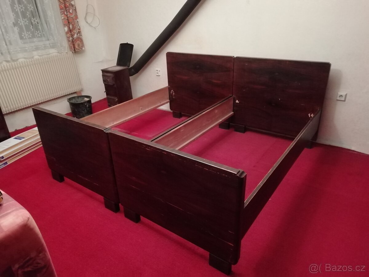 Sestava ložnice, 2x postel (délka matrace 180 cm), 2x noční stolek, 2x skříň (kombinace 2 + 3 dveře), 1x toaletní stolek (zrcadlo se dvěma skříňkami a šuplíkem). Materiál masiv potažený dýhou. Určeno k renovaci.