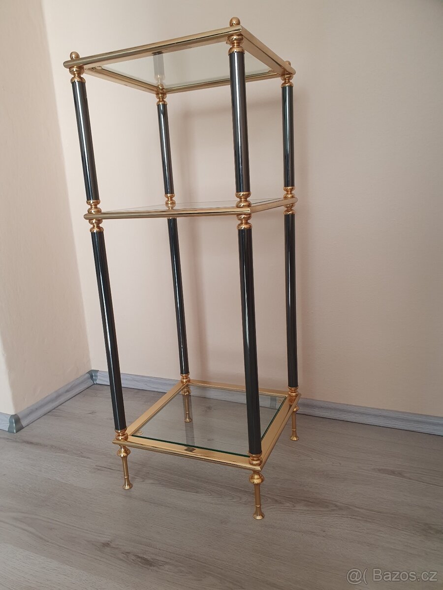 krásně propracovaný kovový regál,rozměr 35x35x90, tři skleněné poličky,perfektní stav bez poškození, jako samostatný solitér na dekorace.
