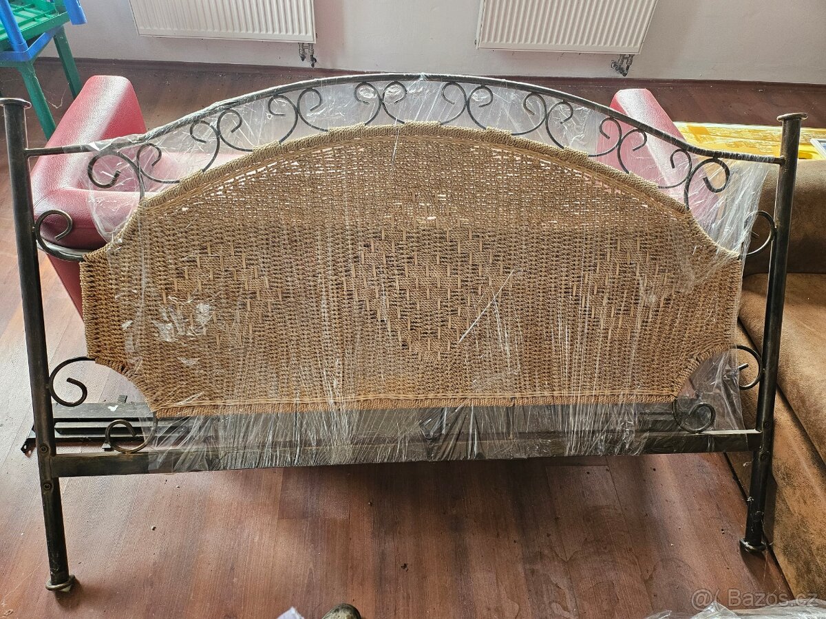 Prodám kovovou manželkou postel s ratanovým výpletem, noční stolky šířka 180cm.