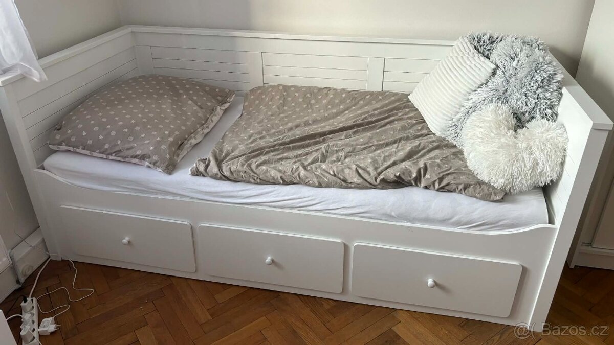 Postel v perfektním stavu má tři úložné šuplíky a ohraničení kolem postele k posteli jsou i prkna nepoškozená