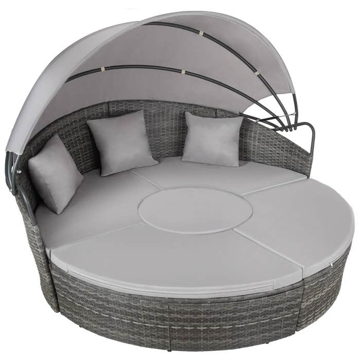 Ratanové zahradní lehátko hliníkové se stříškou - šedá i v prirodni barve.Možno zaslat.Celková šířka: 180 cm • Základní plocha: Ø 156 cm • Výška se sluneční stříškou: 138 cm • Výška se složeným střešním oknem: cca 83 cm • Celková hloubka: cca 171 cm • Hloubka bez stolu a sedacích prvků: cca 81 cm • Výška sedáku s podsedákem: cca 35 cm • Hmotnost: cca 36 kg Stůl:• Průměr: cca 58 cm • Výška: 30 cm Sedací polštáře:• Tloušťka polstrování cca 5 cm Polštář:• Rozměr: cca 40 x 40 x 18 cm Materiály:• Pokrývá 100% polyester • Polyratanová vazba • Hliníkový rám OBSAH BALENÍ • 1 ratanová sestava s hliníkovým rámem • 3 polštáře • 5 polstrovaných sedáků • 1 textilní střecha se čtyřmi žebry • 1 montážní materiál