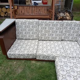 Gauč s nově potaženými podduškami. Nožky k sedačce jsou odlomené, dají se přidělat.
