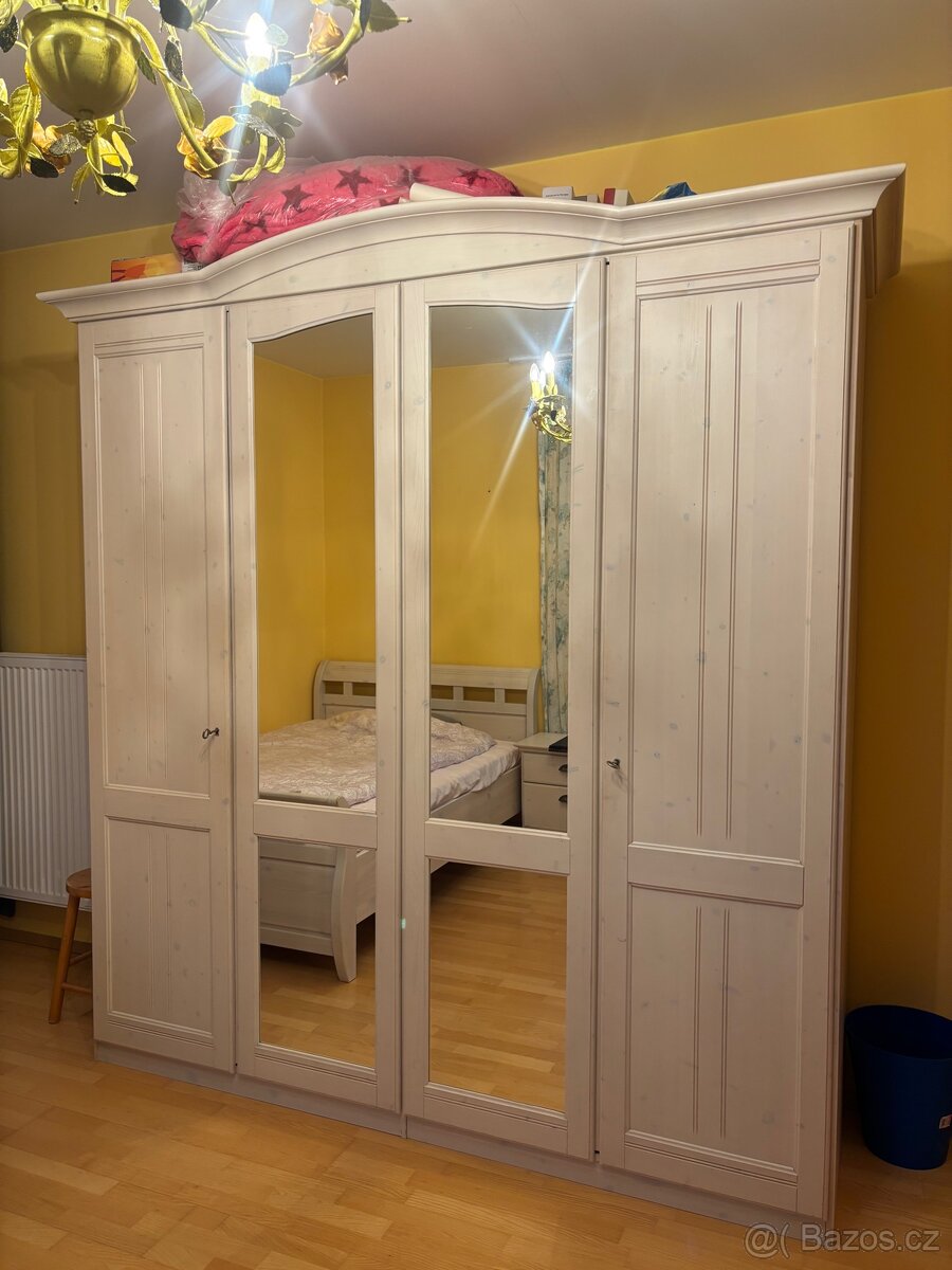 Šroubovicová bavorská šatní skřín - [24.3. 2026]Prodám šatní skříň 2-dviřko s širokou policí a pod ní tyč .Výška 188/šířka 132 s freskami /hloubka 70cm.Je komplet ze dřeva,masivní.Původni kování a funkční zámek s klíčem.