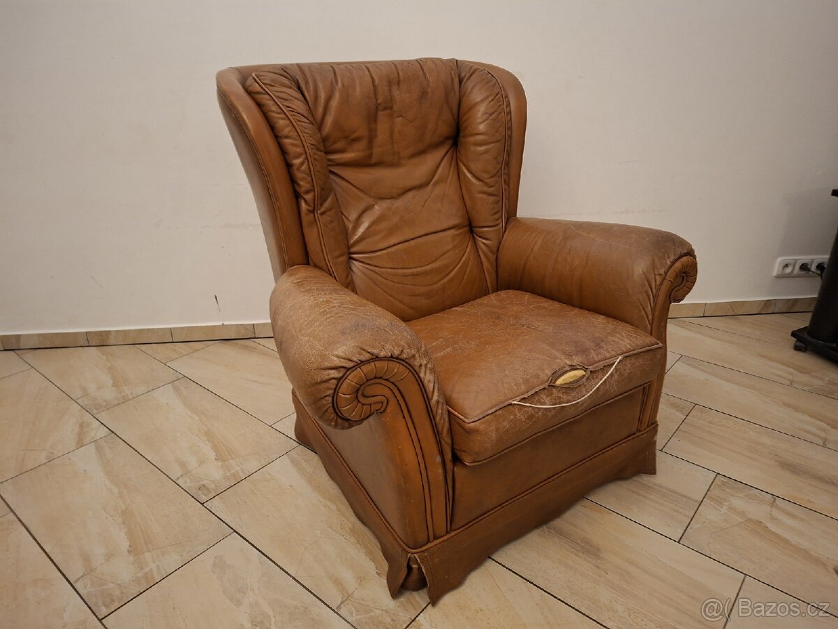 Křeslo kožené Ušák, poškozené