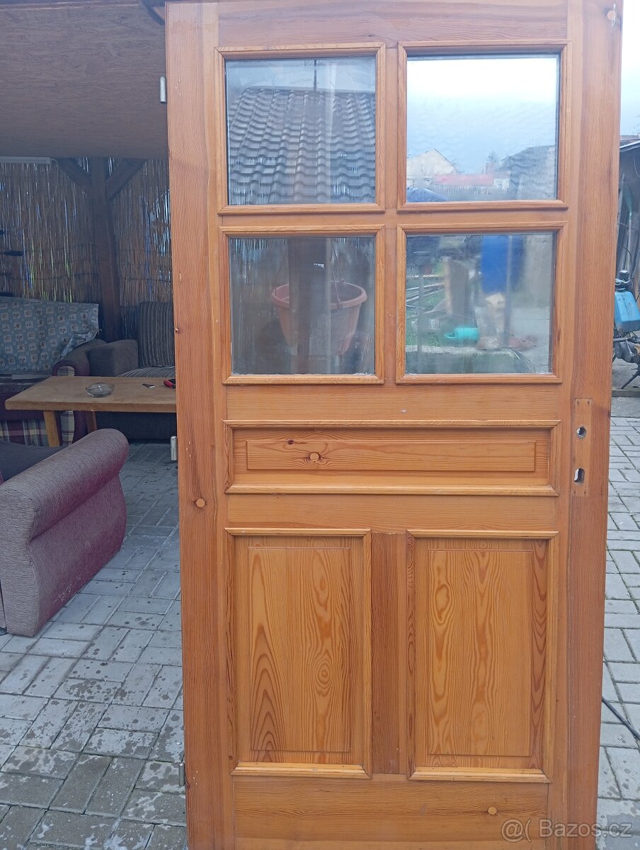 Prodám použité masivní dveře z borovice (levé), jedna tabule skla prasklá viz foto.