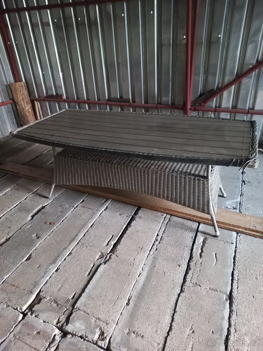 Prodám venkovní zahradní stůl. Materiál kov oplétaný umělým proutím, jedna strana na vrchní desce bez opletu. Prkna - umělá hmota, odolné venkovnímu počasí. Rozměr 200 x 100 x 75. Pevná konstrukce.