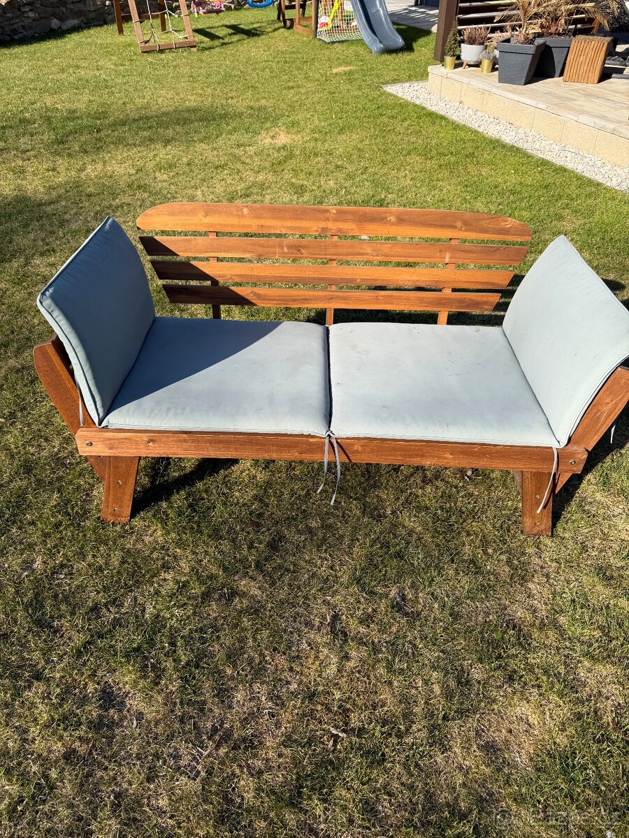 Zahradní lavička - [5.3. 2026]Prodám dřevěnou lavici s polohovatelnými bočnicemi a polstry . Stáří 2,5 roku.Lavice dostala čerstvý nátěr šedo hnědý. Výška 75 cm,šířka 57 cm, délka při rozložení 188 cm, výška od země k sezení 35 cm. Cena je za komplet.Potahy pratelný.!!! Viz foto. ...