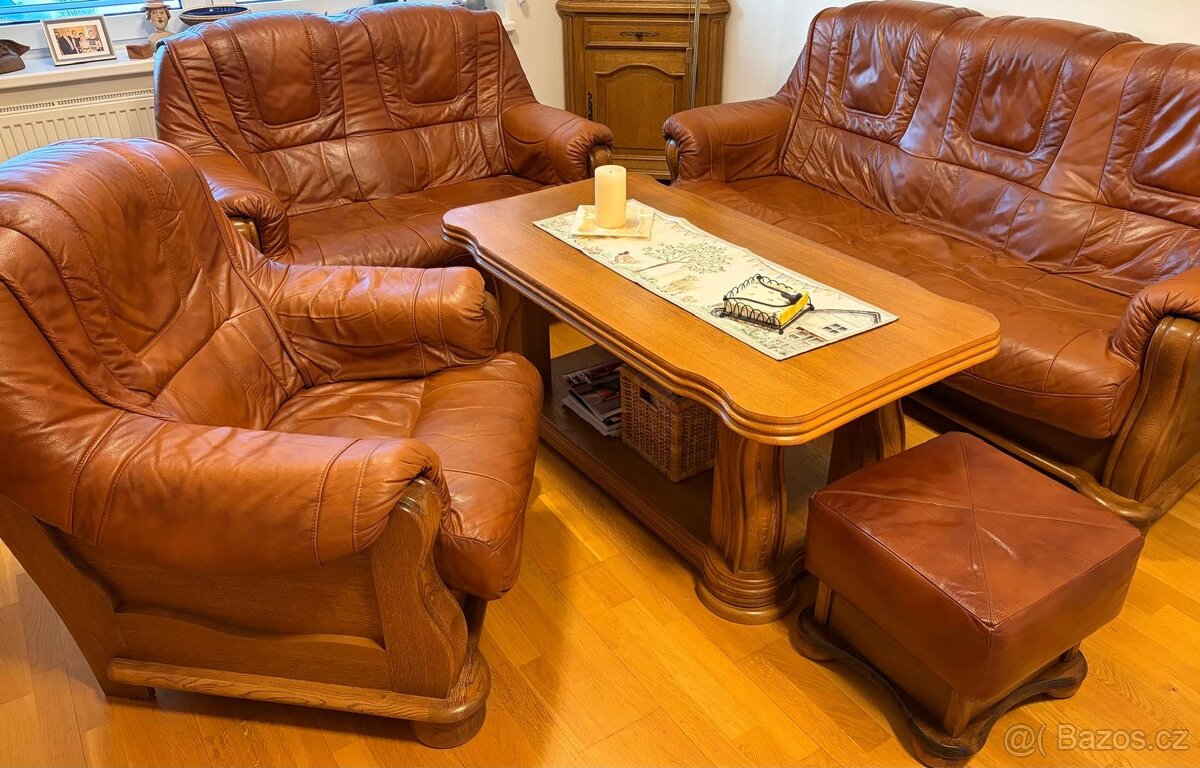 Nabízím rustikální koženou sedací soupravu. Souprava obsahuje tři-mistny gauč, dvou-mistny gauč, křeslo a taburet. Sedací souprava je v dobrém stavu, pouze na područce křesla je mírně poškozený lem (viz foto). Pouze osobní předáni.