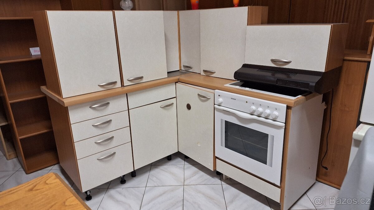 Kuchyňská linka německé výroby v pěkném stavu. Dřez, baterie, horkovzdušná trouba, sklokeramická deska, kolotoč, dorazové tlumící pojezdy.