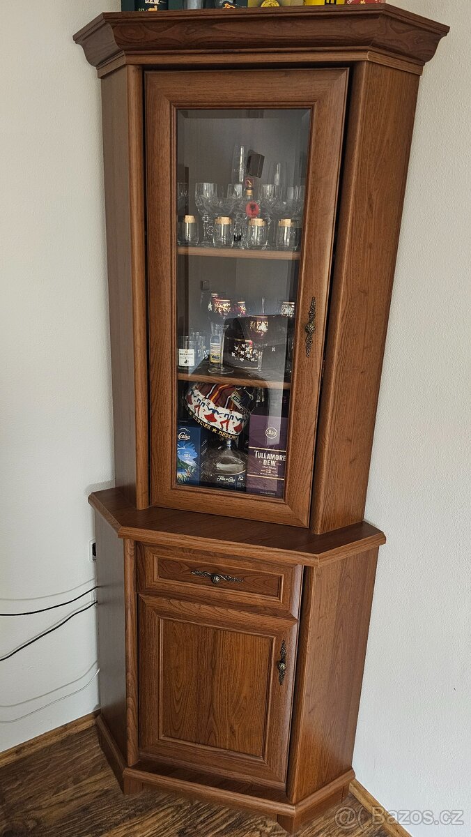 Rohová skříň, částečně prosklená. Lamino / kaštan.