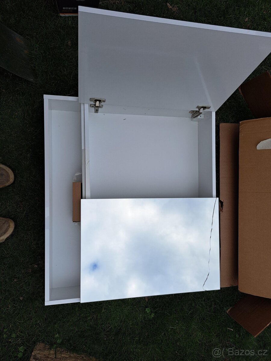 Zrcadlová skříňka s poličkou o rozměru 80x72 cm. Rám zrcadla v bílé barvě. Pasklé zrcadlo viz foto, ale někomu třeba přijde vhod….