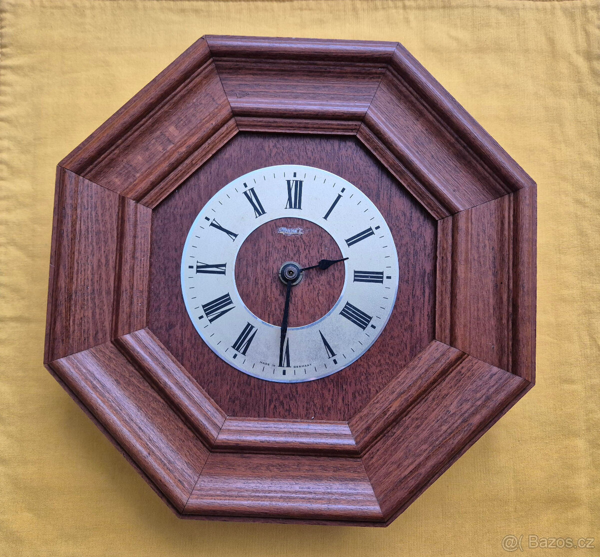 Hodiny nástěnné, dřevěné, 8 úhelník, 24cm průměr, kvalitní německé, strojek Quartz, na 1 tužkovou baterii. Plně funkční, velmi pěkné. Osobní převzetí, zásilkovna. Pouze volat. Děkuji.