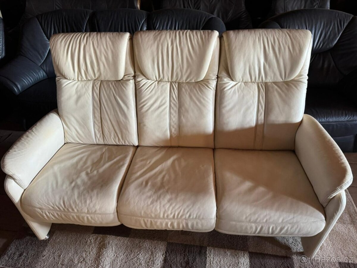 Kožená sedací souprava - TOP - [15.3. 2026]Krémová kožená pohovka a dvě křesla. Rozměry pohovky šířka 210cm, výška 85cm, hloubka 95cm. Rozměr křesel šířka 115cm, výška 85cm, 95cm. Pohovka používaná, křesla téměř nepoužitá, ve výborném stavu. Možné koupit i jednotlivě; v tom případě cena dohod ...