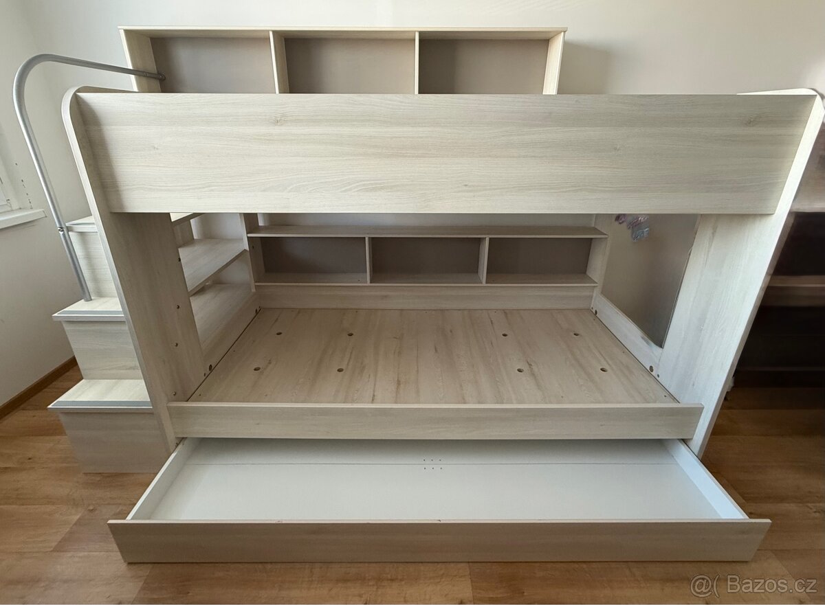 Výsuvné třetí lůžko (šuplík) bylo při stěhování poškozeno a je lepené – funkční, ale má kosmetickou vadu.