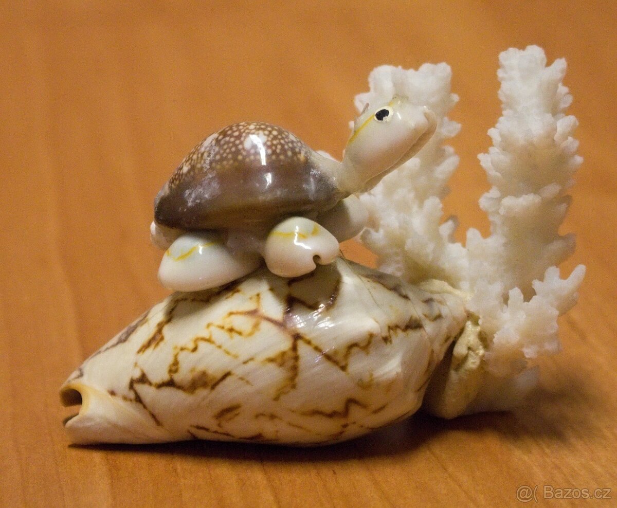 Na obrázku je soška vyrobená z mušlí, která sedí na větší mušli a vedle ní je korál. Jedná se o dekorativní předmět. Soška je suvenýr z Egypta. Délka 8 cm, výška 6 cm. Nové.