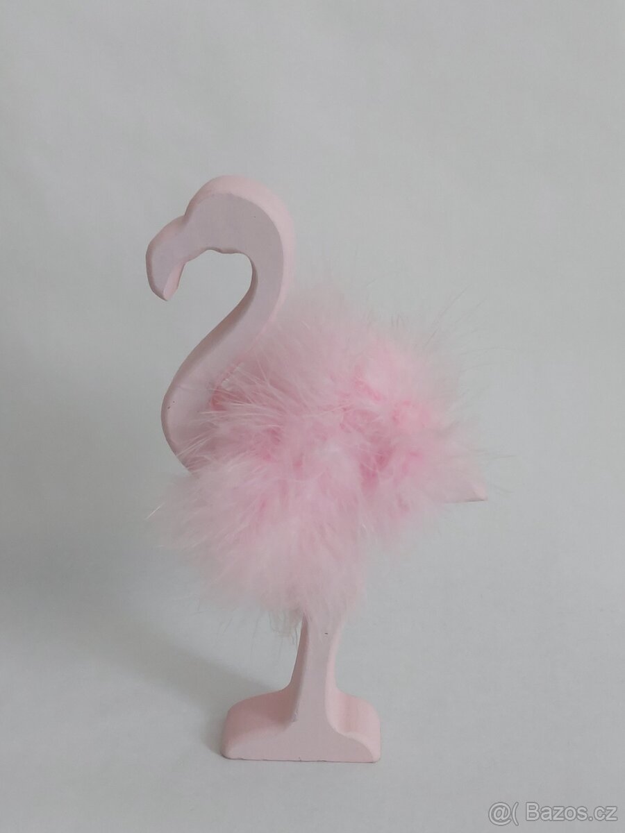 Dekorace růžový plameňák s peřím, na rpzobaku trochu poškrábání ale jinak vpoho