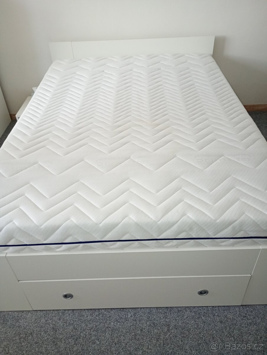 Prodám postel 140x200 s kvalitní matrací (včetně roštů). Používáno cca 3 roky. Postel má úložný prostor (3 šuplíky), poličky a výsuvné noční stolky. Velmi dobrý stav.