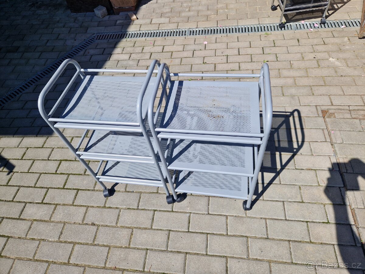 Pojízdný kovový regál / vozík – 5 polic - [25.3. 2026]Prodám použitý pojízdný kovový regál (vozík) na kolečkách. Konstrukce obsahuje celkem 5 polic: 3 praktické výsuvné koše a 2 pevné stabilní police.