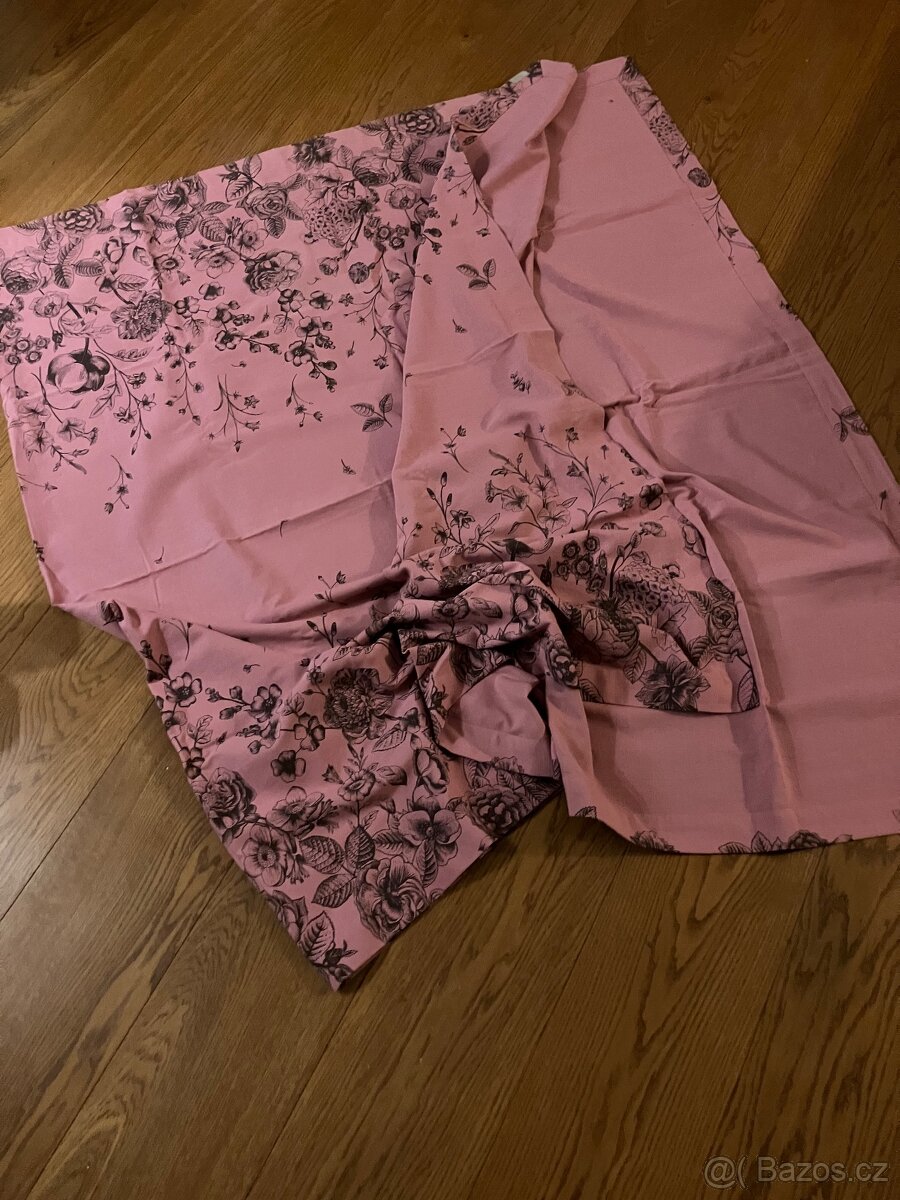 Ubrus Atelier 140x240 - růžový s černý květinovými motivy + malý růžový ubrousek. Nový, koupena špatná velikost.