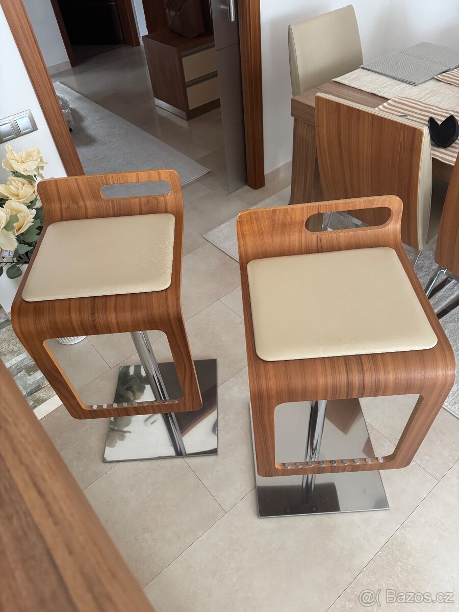 Prodam 2x barovou stolicku, vyskove stavitelna, podnoz a zakladna nerez, sedak lisovana dyha orech, kuze. Tener nepouzivane. PC jedne stolicky byla 17.000,- Nyni kus za 10.000,-