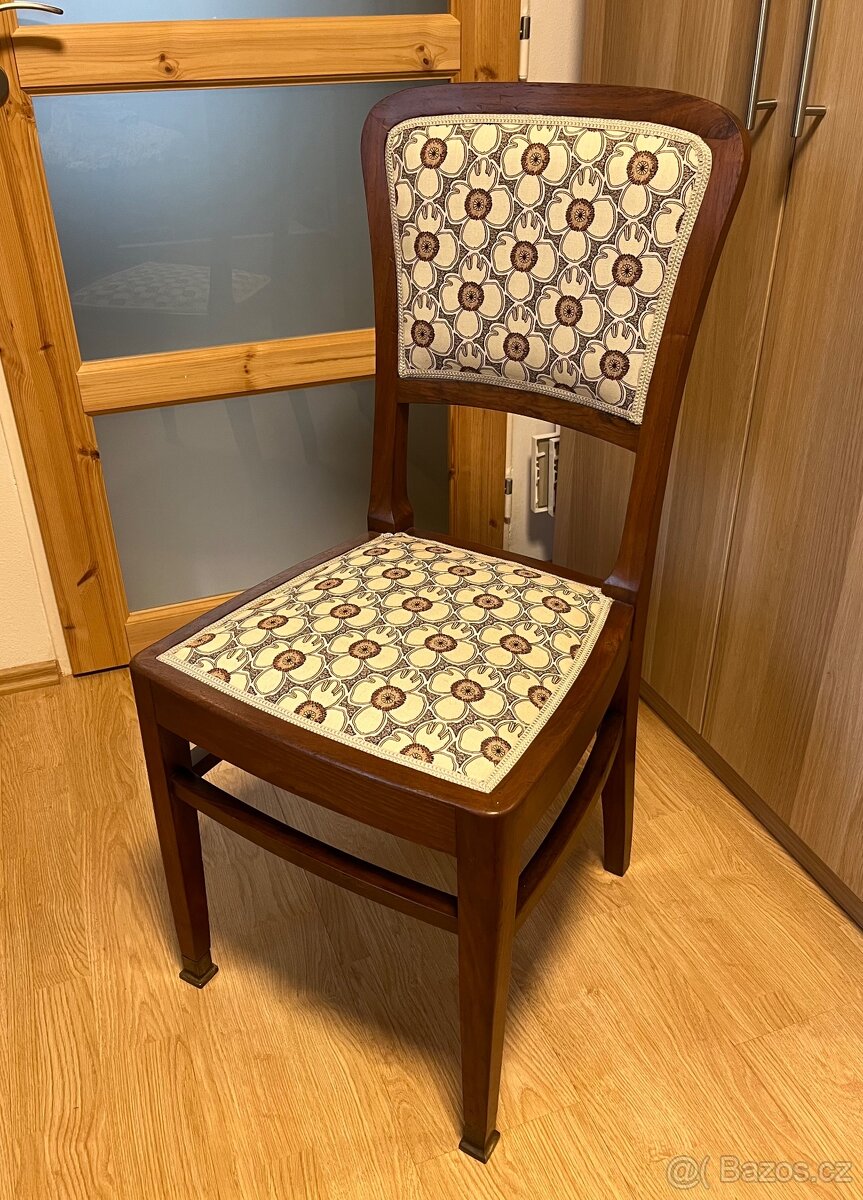Secesní židle - [1.3. 2026]Prodám secesní židli, nově zrestaurována . Nové čalounění. Výška do sedáku 50 cm.