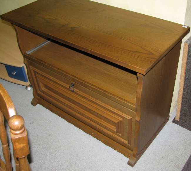 Rustikální tv stolek - [19.4. 2026]Prodám kvalitní, zachovalý rustikální tv stolek z masivu (dub). Otočná horní deska, vysouvací police.