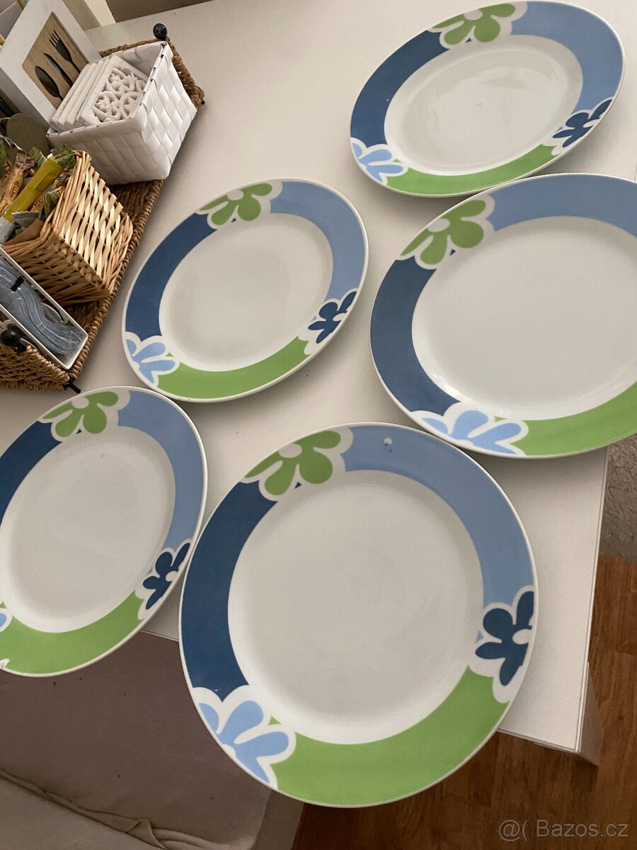 5x talíř- 4 jsou v pořádku a jeden má oťuk viz. foto. ten je k talířům zdarma. průměr 23 cm. osobní odběr i zásilkovna