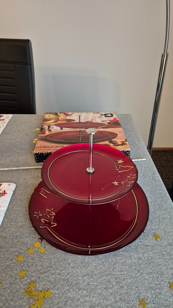 Prodám Vánoční etažér se zlatým nápisem Merry Christmas: rozebírací dvoustupňový červený talíř na cukroví/ovoce.