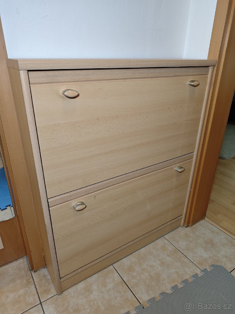 Botník borovice - [26.3. 2026]Prodám kvalitní dřevěný botník z borovicového masivu, natřený bezbarvým lakem. 4 police s vyklápěcími dvířky, 2 šuplíčky, prostor za dvířky dělený 1 poličkou. Pěkný, bez poškození a vad. Rozměry: š 95 cm, v 81 cm, hl 41, výška nožek 6,5 cm, síla mate ...
