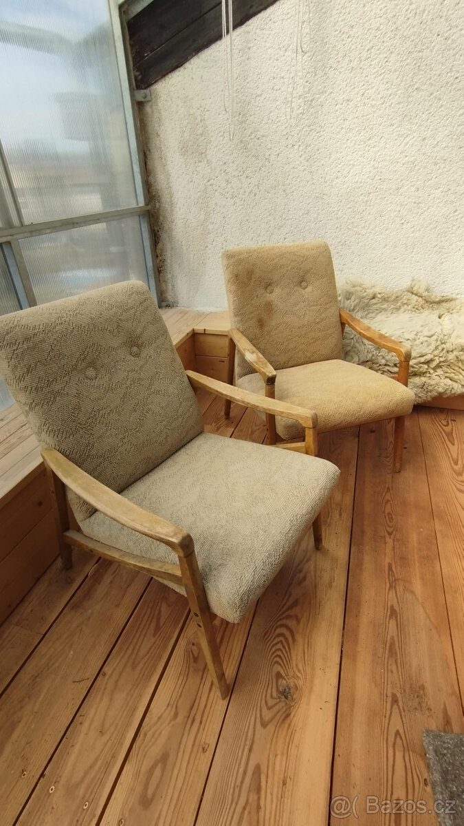 Retro křesílka k renovaci.Pevná.Dřevo je potřeba ošetřit. 600,-- Kč/kus.