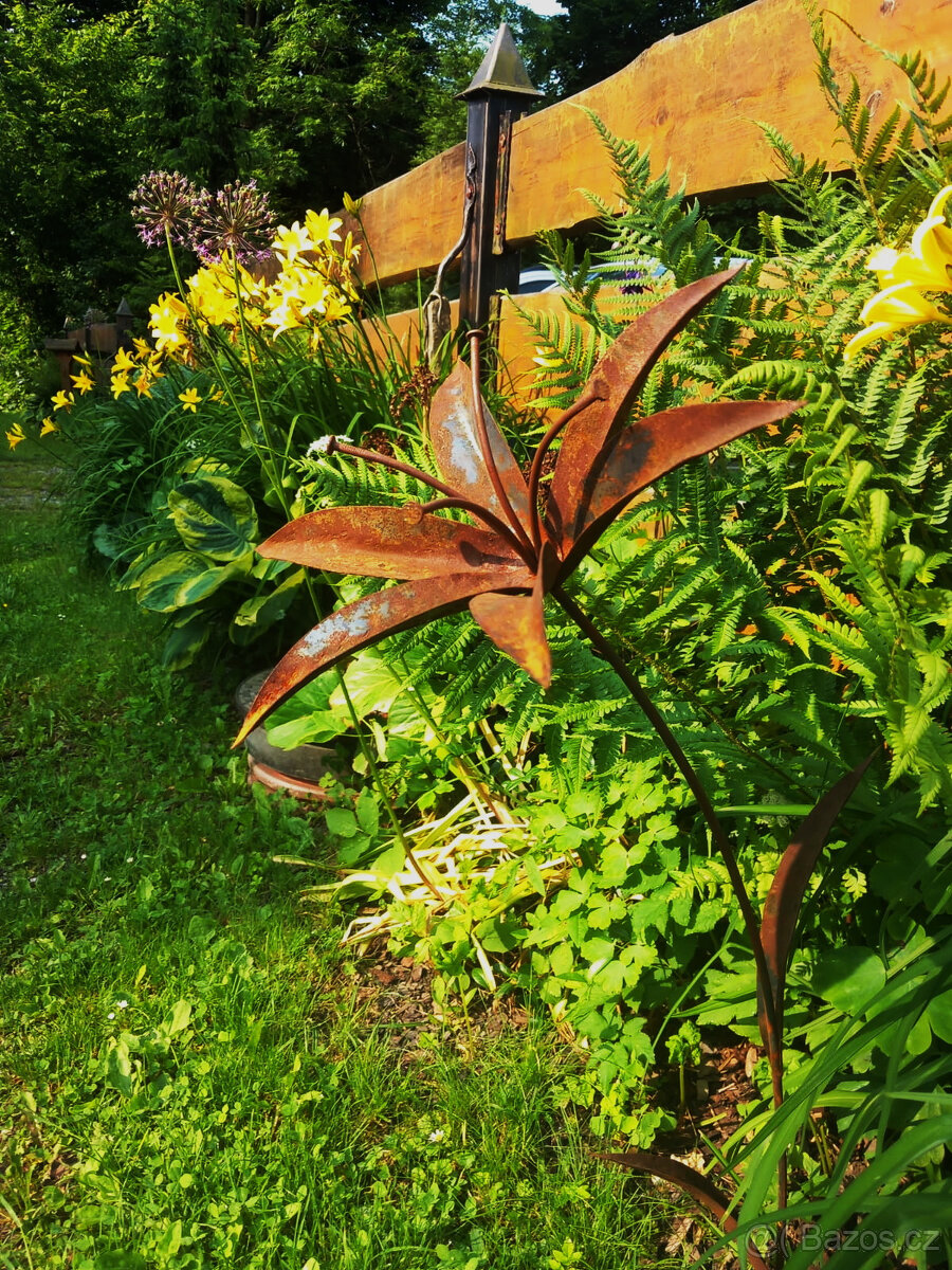 Ručně kovaná květina - Lilie. Květina je tvořena 6 okvětními lístky a 3 pestíky. Na klenutém stonku jsou dva listy. Tato varianta Lilie je ponechána bez laku . Přirozený korozivní odstín tak zvolna zapadá do scenérie rostoucích květin, kde vytváří krásný barevný kontrast . Výška květiny je přibližně 1m. Vhodná do exteriéru i interiéru.