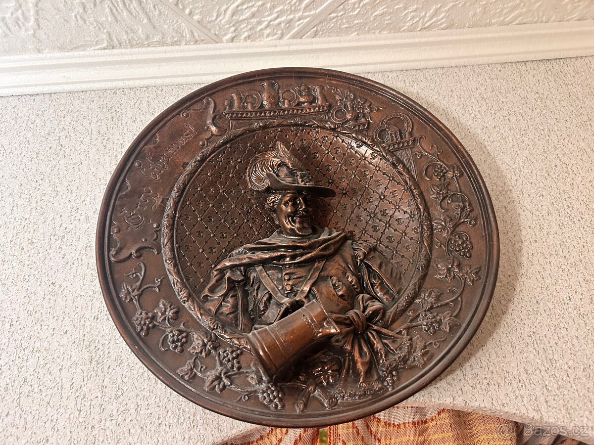 Dekorativní reliéfní závěsný retro talíř s motivem rytíře a džbánu.