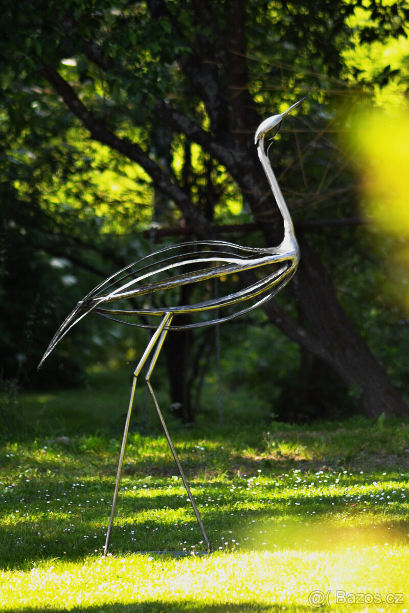 Ocelová silueta volavky se vznáší nad zemí jako kresba ve vzduchu. Lehce se dotýká trávy, její tělo je jen náznak, linie, gesto.