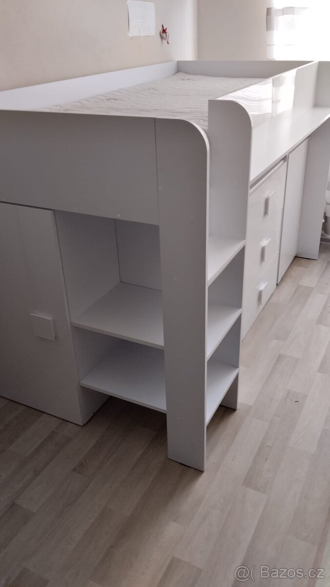 1 skříňka na ramínka,3 šuplíky. Matrace 190x200cm.Cena 9500 Kč i s matrací