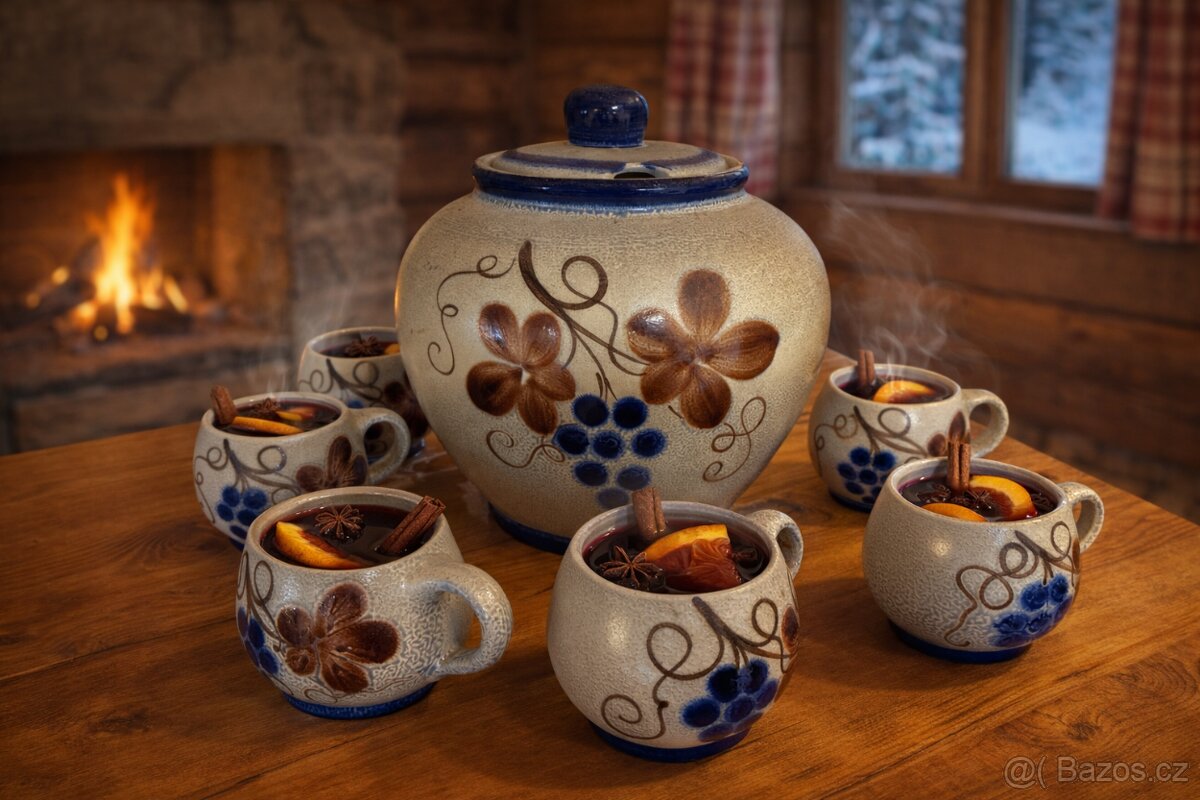 Nabízím stylovou keramickou soupravu na svařené víno / punč / čaj, složenou z větší nádoby s víkem a 6 silnostěnných hrnečků.