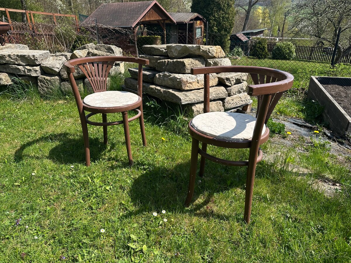 Prodám dvě staré židle v pěkném stavu, v minulosti přelakovány na hnědo. Jsou pevné.