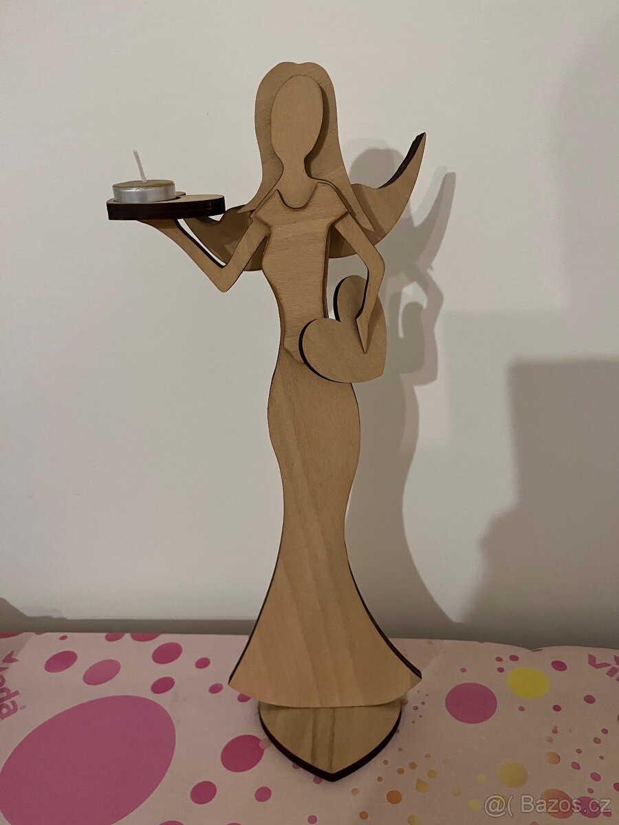 ANDĚL DŘEVĚNÝ 3D V-35 CM. Nový, vhodný jako dárek. Je vyroben z šesti vrstev dřevěné překližky. Tloušťka je 25 mm. Cena 430,- Zašlu Zásilkovnou, Balíkovnou.