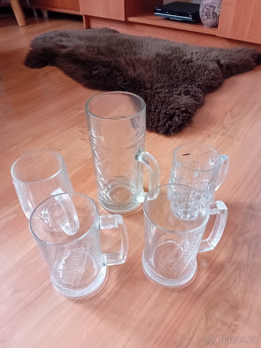 Skleněné půllitry s uchem, jediný tuplák lehce uštíplý