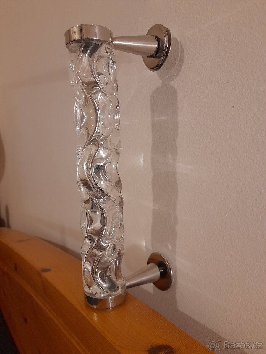 Délka tvarovaného skleněného válce je 24 cm, rozteč pro úchyt 23 cm, terče pro uchycení cca 7-8 mm silného skla (průměr madla je cca 3,5cm). Tyčka, na které je madlo navléknuté není po kompletaci zvenčí vidět. Manžety a úchyty leštěný nerez. Kvalitní zpracování. Madlo je hladké příjemné na dotek. Reprezentační prostory. Neodebraná zakázka.