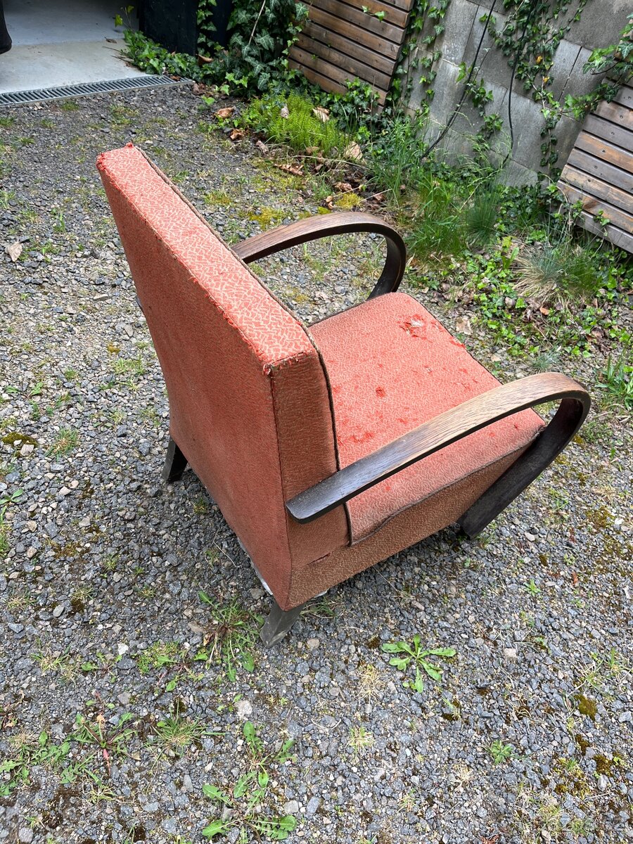 Křeslo - [22.4. 2026]Křeslo alá Halabala. Dle vzoru látky prý někdy z 50. let. Stav z pozůstalosti, ale v docela dobrém stavu.