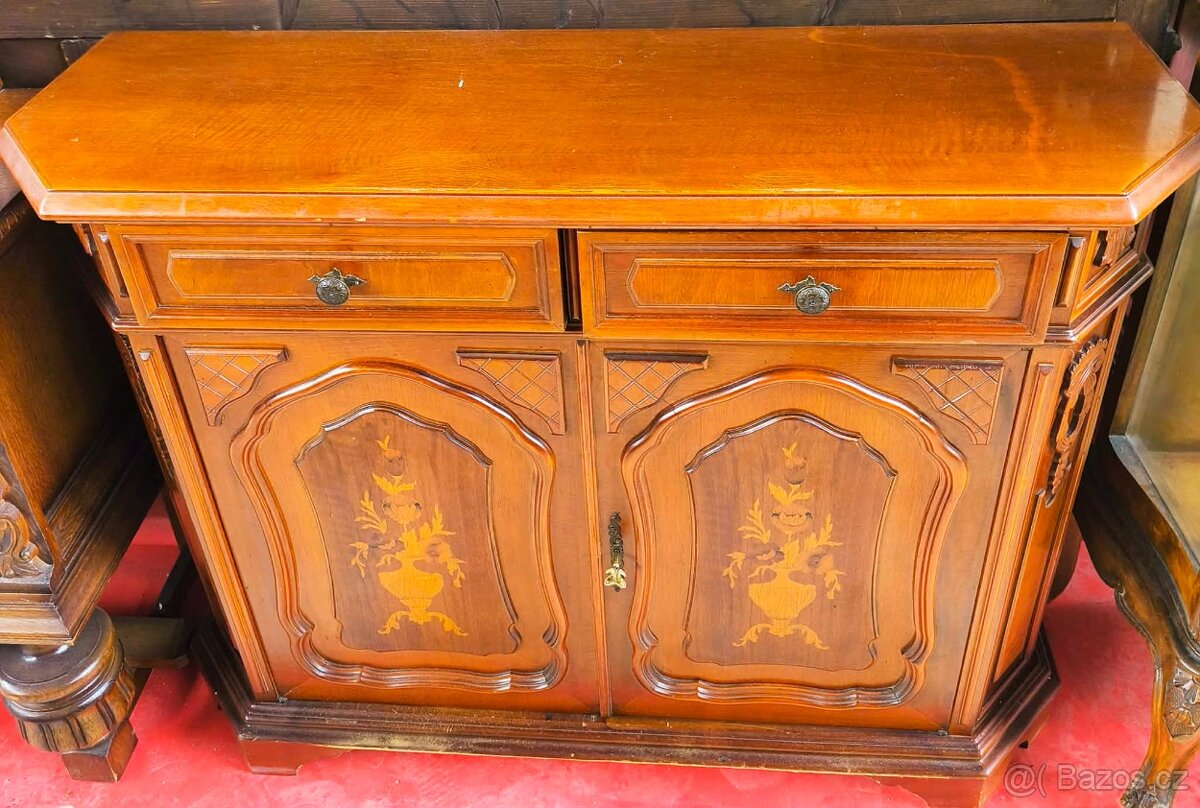 Menší komoda. Šířka 124 cm, výška 93 cm, hloubka 41,5 cm. Možnost přepravy