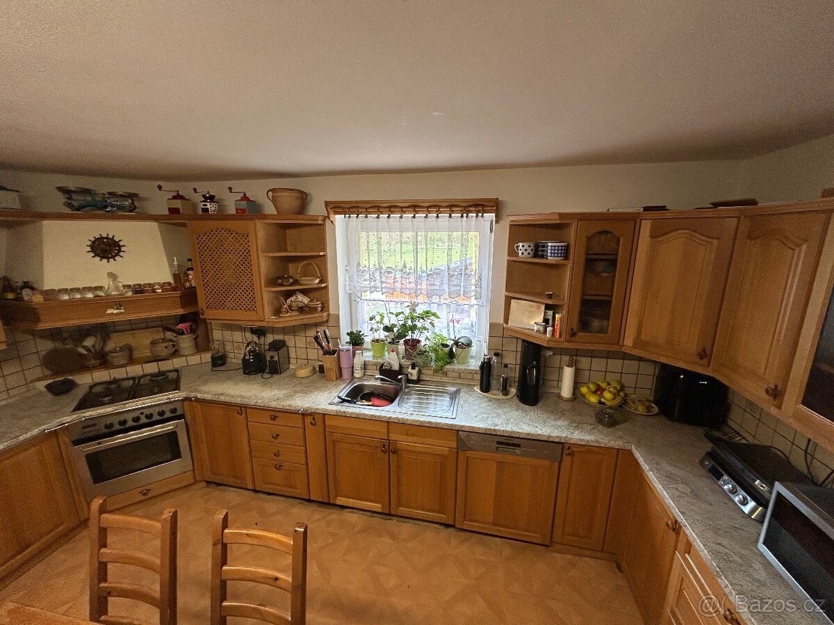 Kuchyň DUB MASIV, drobné známky užívání, nutná výměna pracovní desky. Lednice, myčka, mikrovlnka, varná plynová deska a digestoř jsou k dispozici v ceně kuchyně.