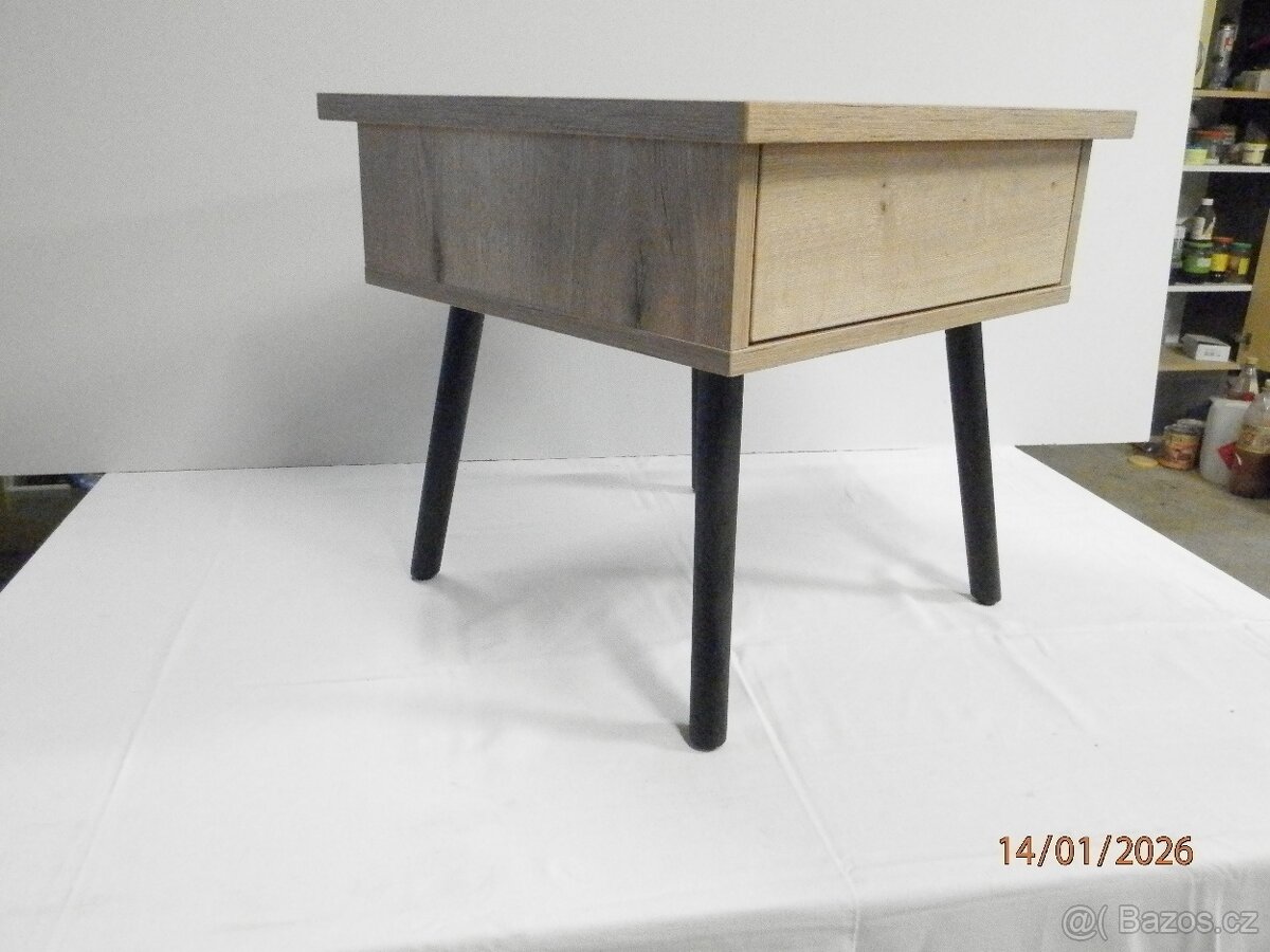 Na prodej nový, ve stylu retro, zhodnocení materiálu!!konferenční stolek odstín dub a černé nohy, zásuvka na celovýsuvu s dotykovým otevíráním. 600-600 mm, Kvalitní hrany,pevné. Nohy lze sundat, takže po dohodě možno poslat. K stolku bude velká komoda v stejném stylu, možno použít pod TV. Výměna za solidní městské kolo možná.
