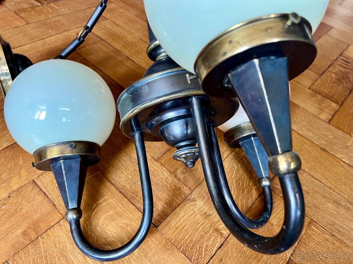Lustr mosazný starožitný - [23.4. 2026]Lustr mosazný starožitný, 3 ramenný, k repasi, skleněný "kalich" pouze jeden kus, jinak kompletní. Prodám za 1350,-Kč