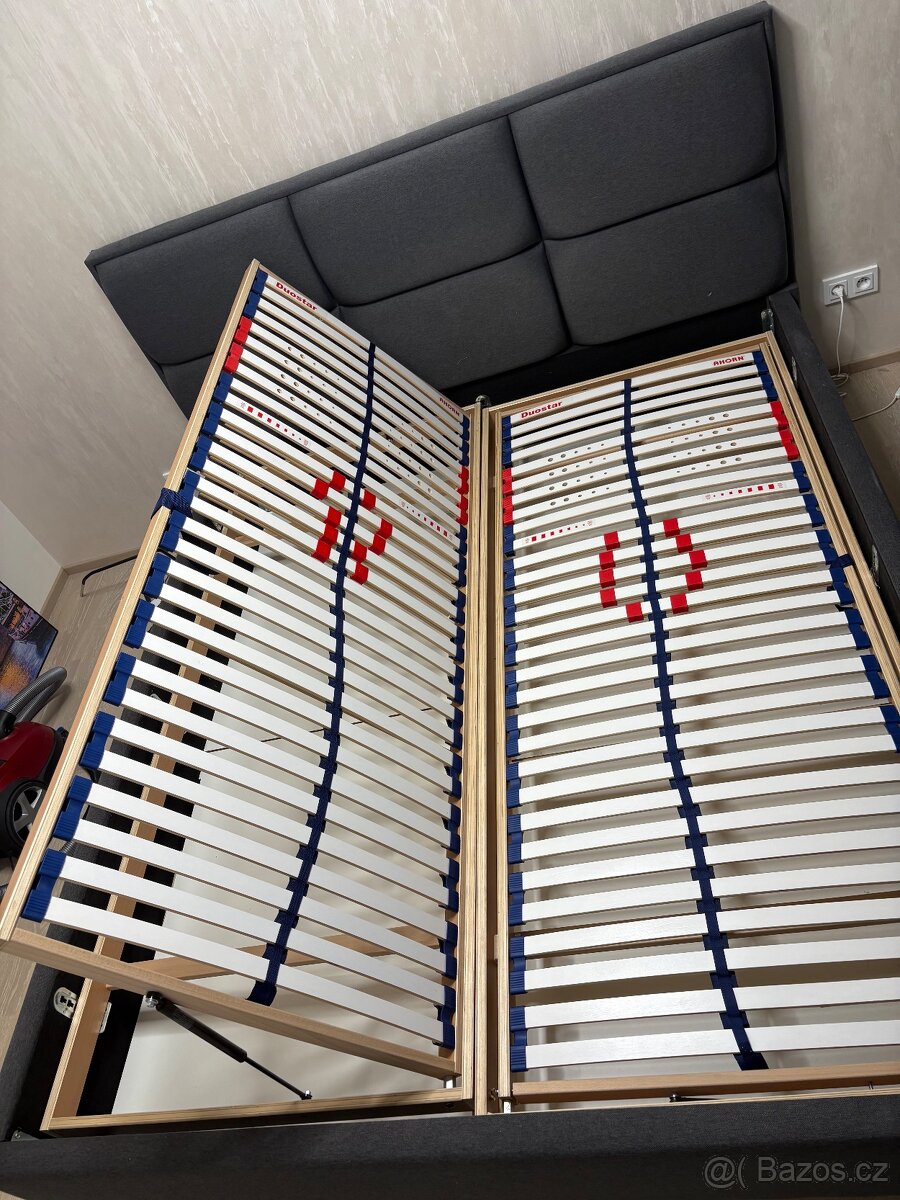 Kvalitní 4 roky stará čalouněná postel s rozměry 180 (šířka) x 210 (délka) a úložným prostorem a dvěma rošty. Původní cena 28.500 Kč.