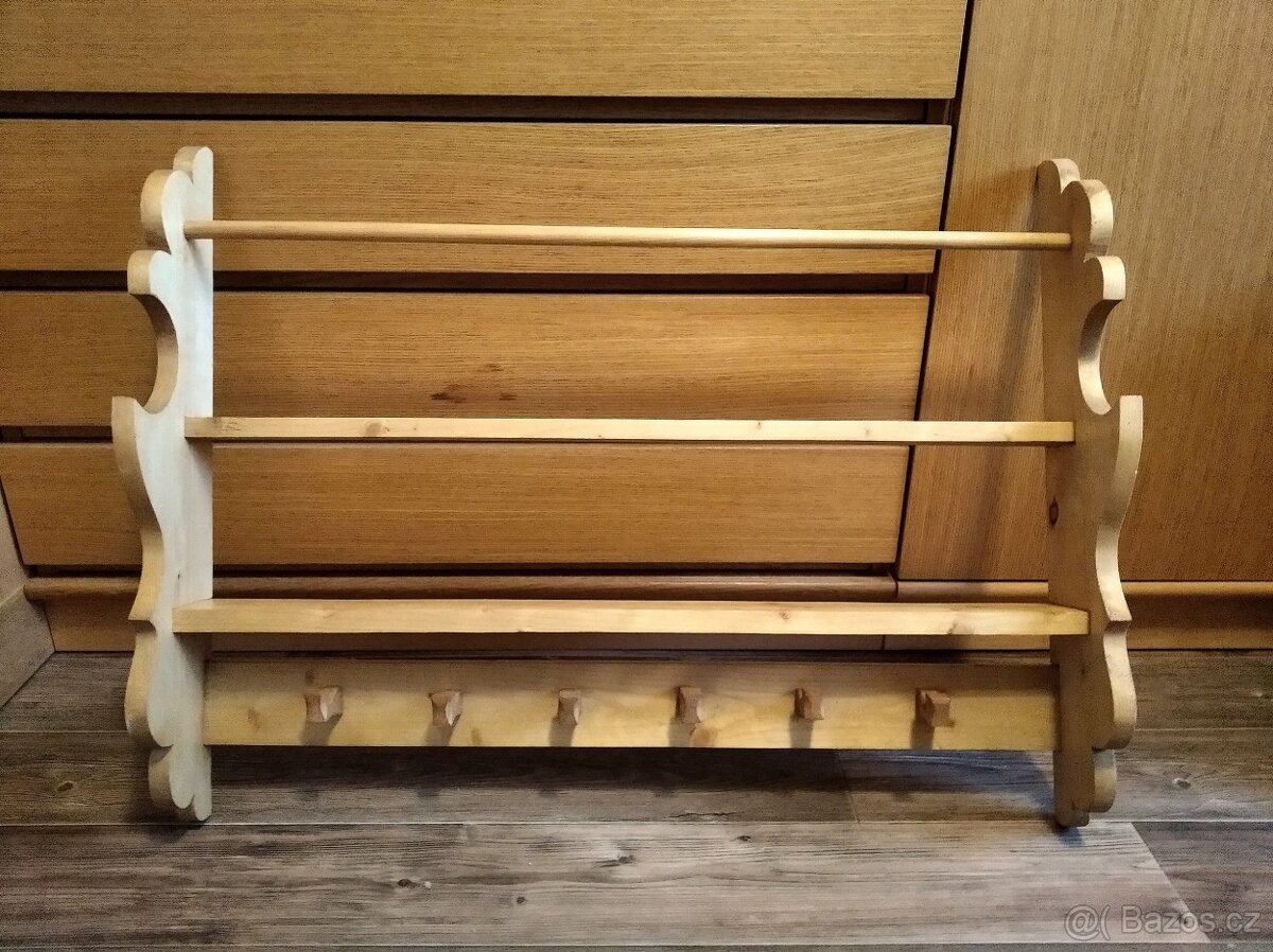 Prodám dřevěnou rustikální polici k zavěšení na zeď. Domácí výroba, zcela nová, nepoužitá. Rozměry 75 x 55 cm. Nátěr bezbarvý lak. Vhodná na chatu, chalupu... S ohledem na rozměry pouze osobní odběr.